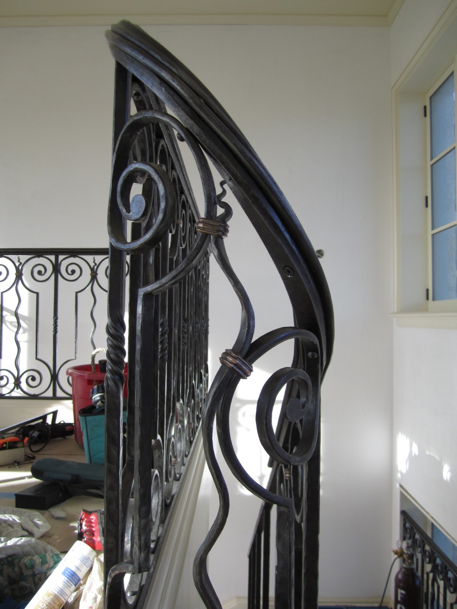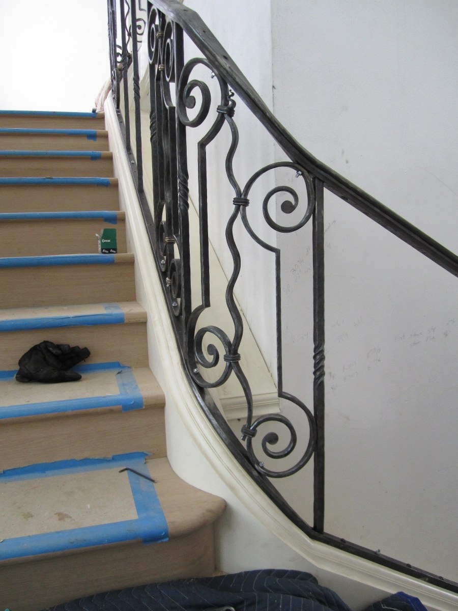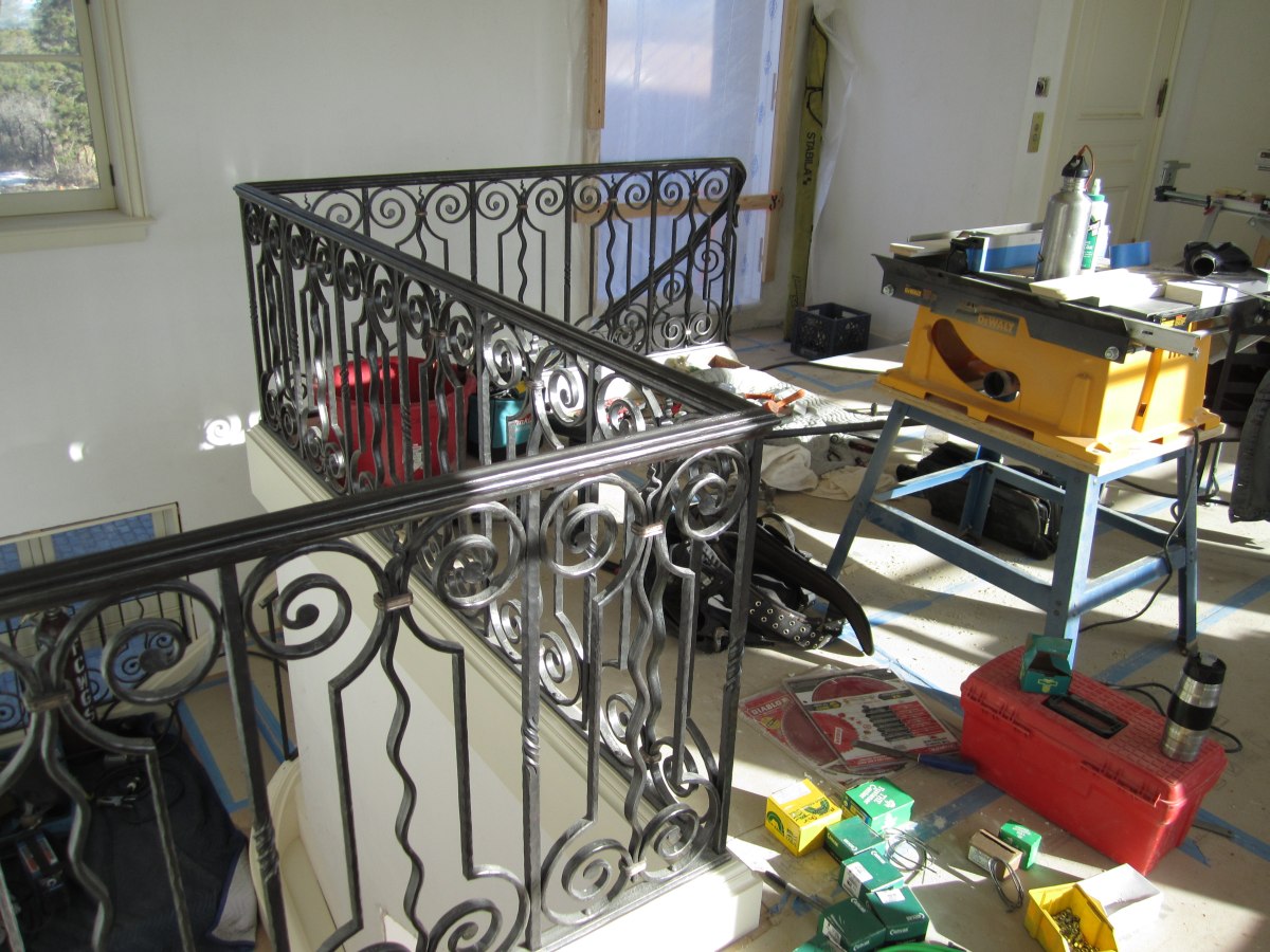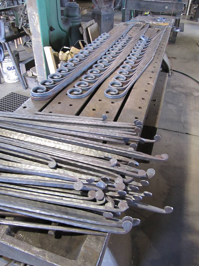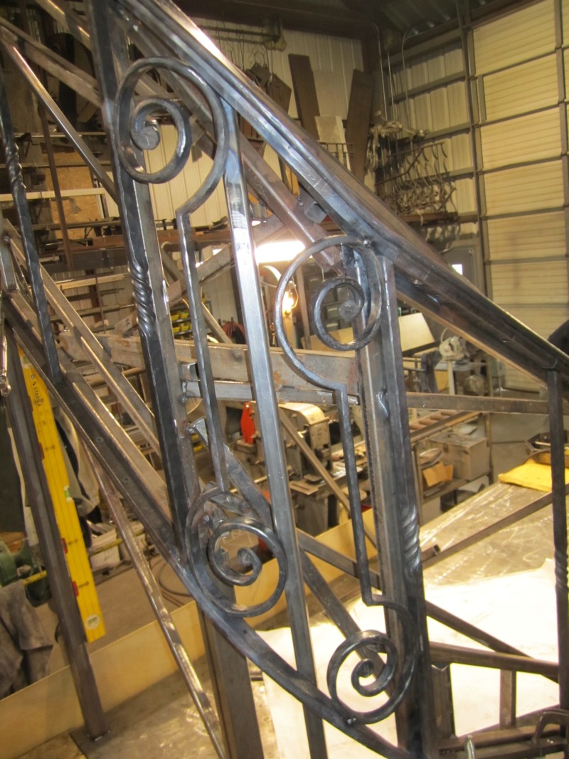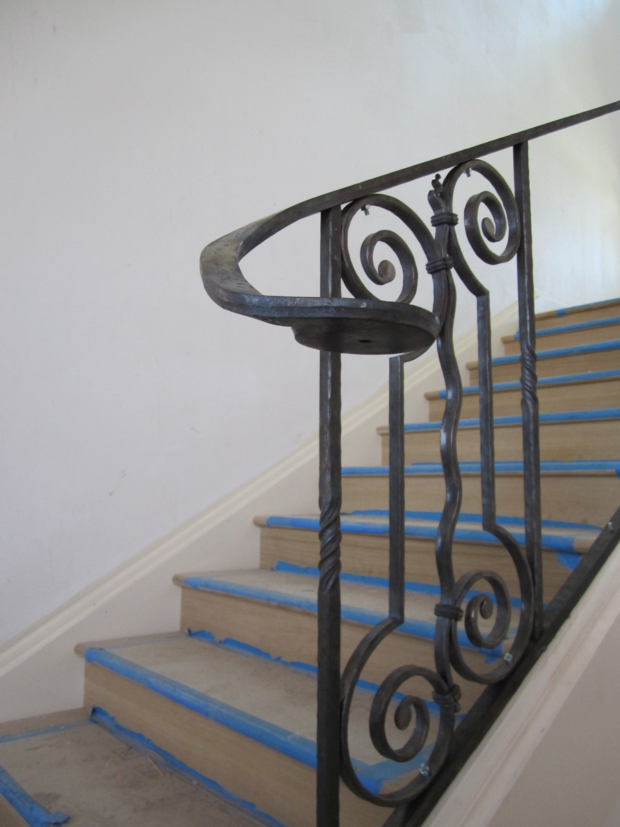 The woodworker provided the wood stringer form so that we could make a steel form to forge the top and bottom rails. This allowed us to hot bend the iron to lie perfectly on top of the stringer.