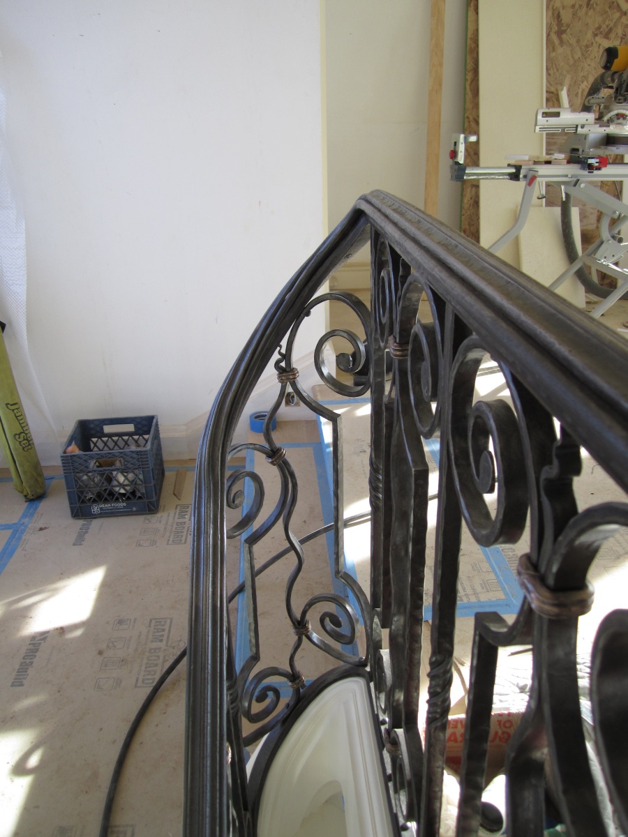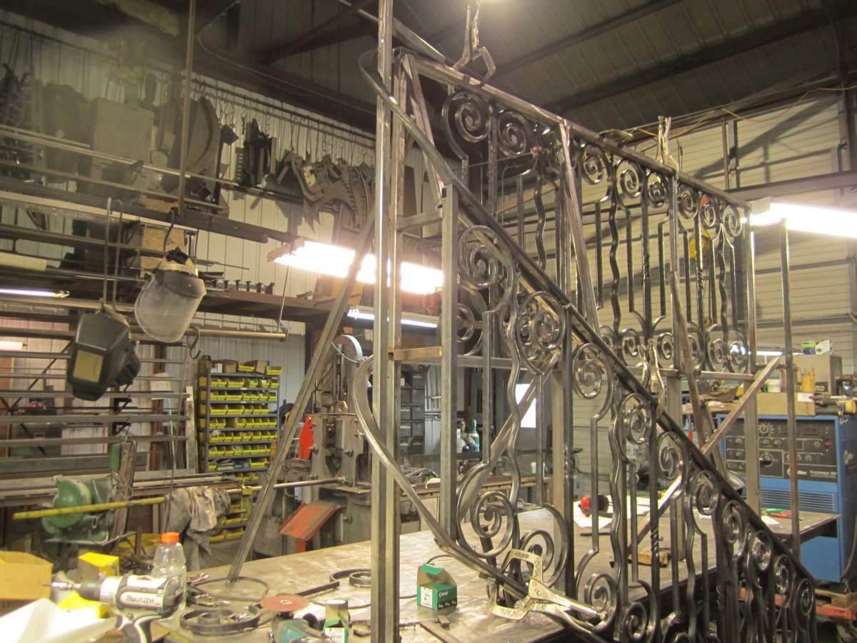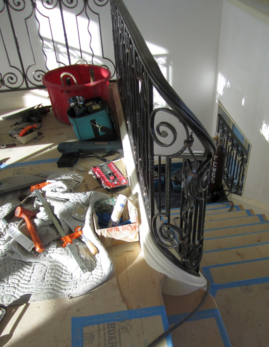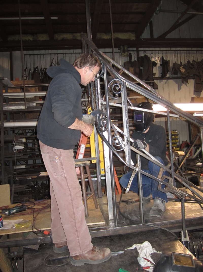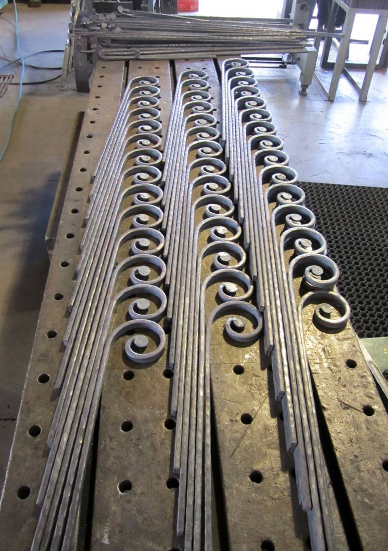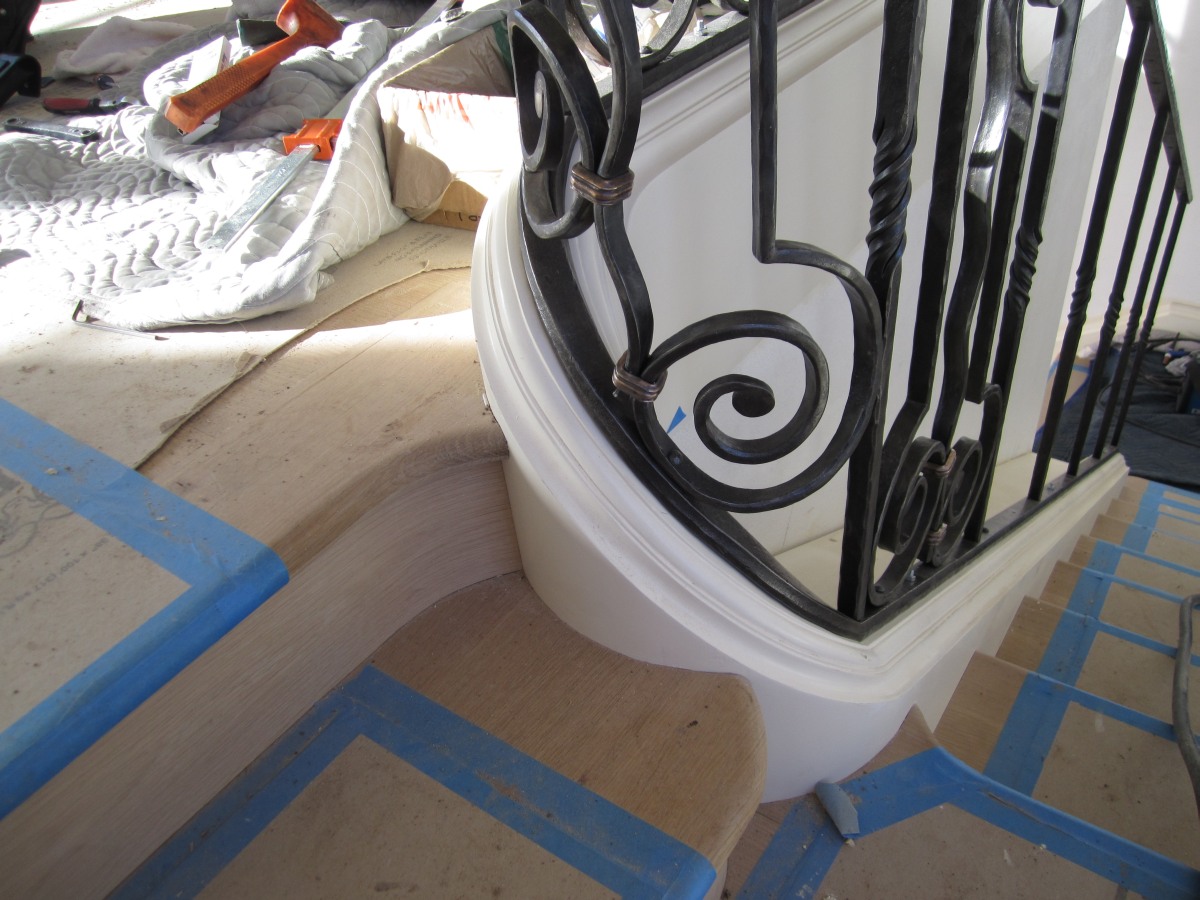 The woodworker provided the wood stringer form so that we could make a steel form to forge the top and bottom rails. This allowed us to hot bend the iron to lie perfectly on top of the stringer.
