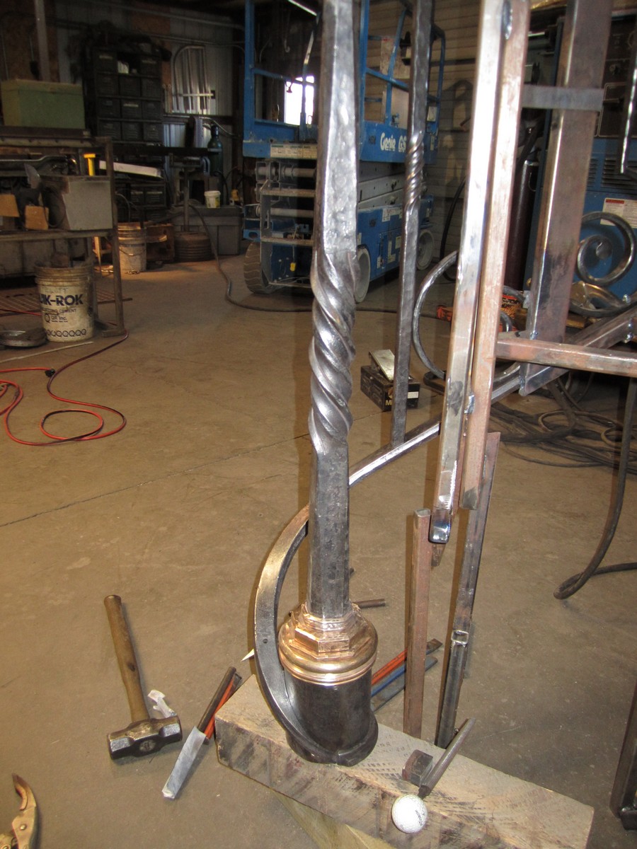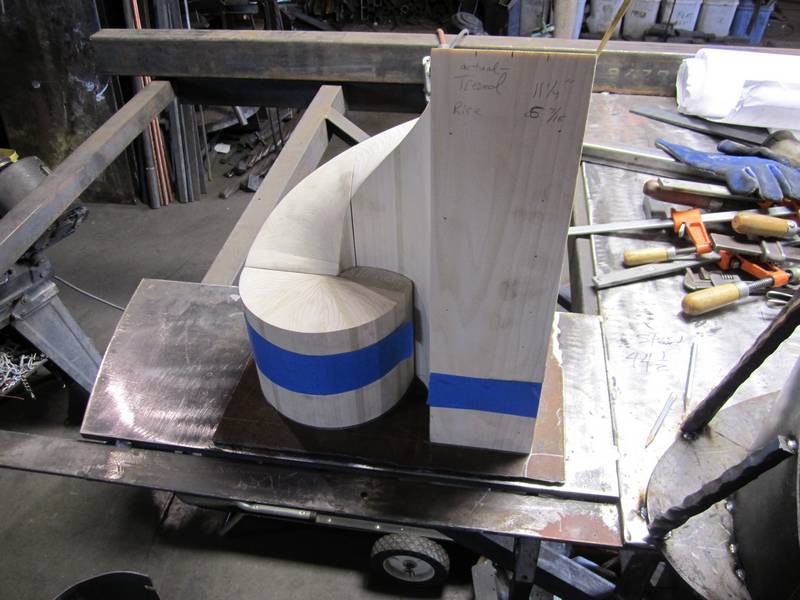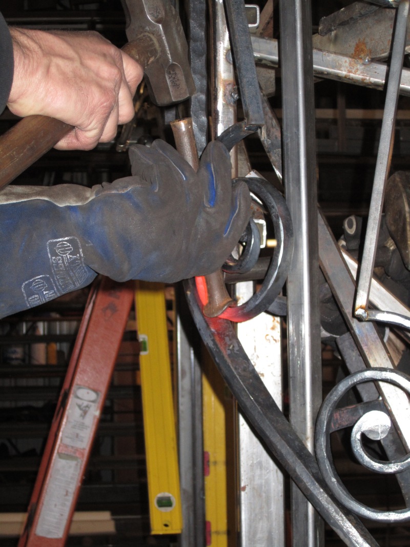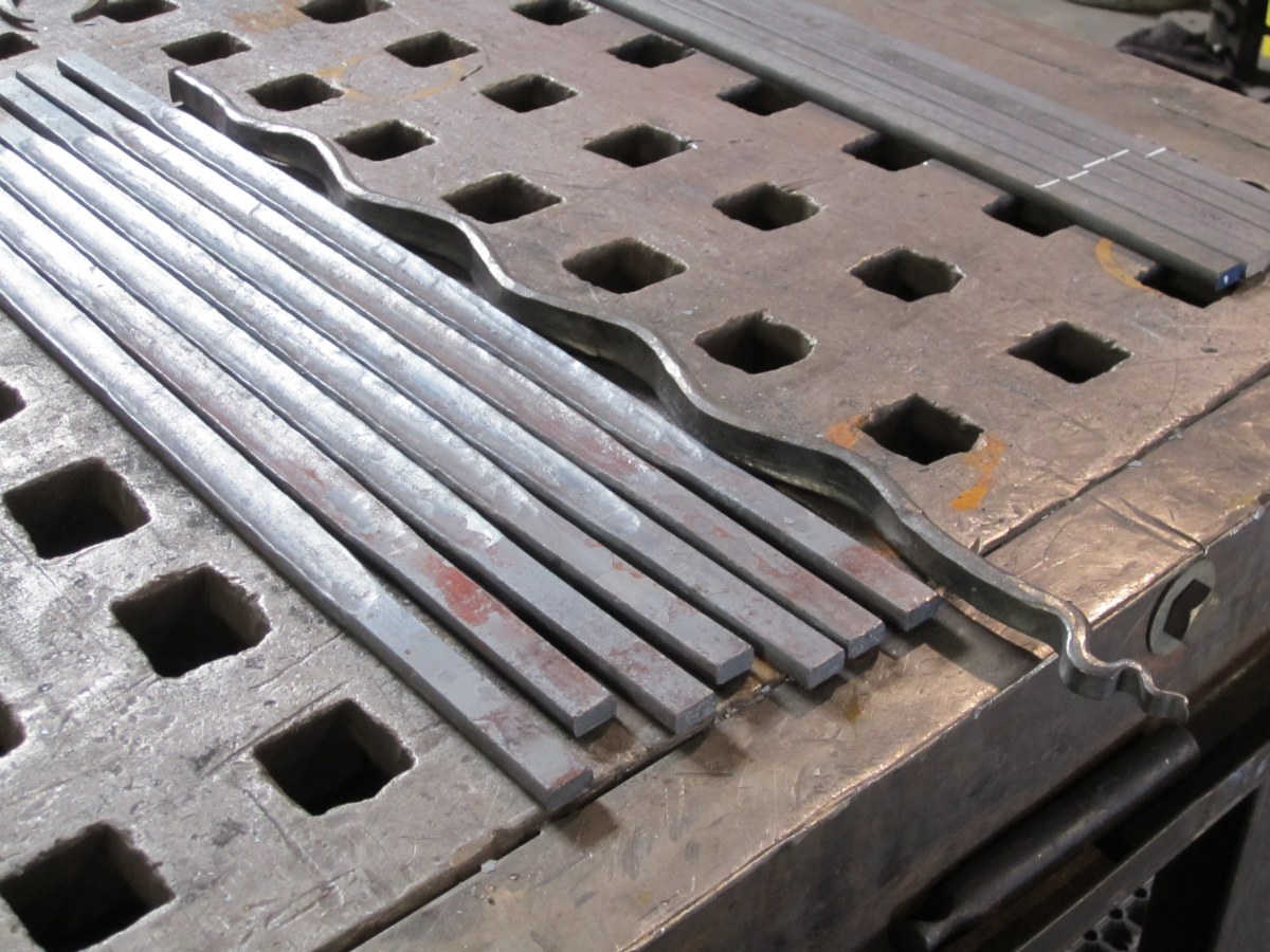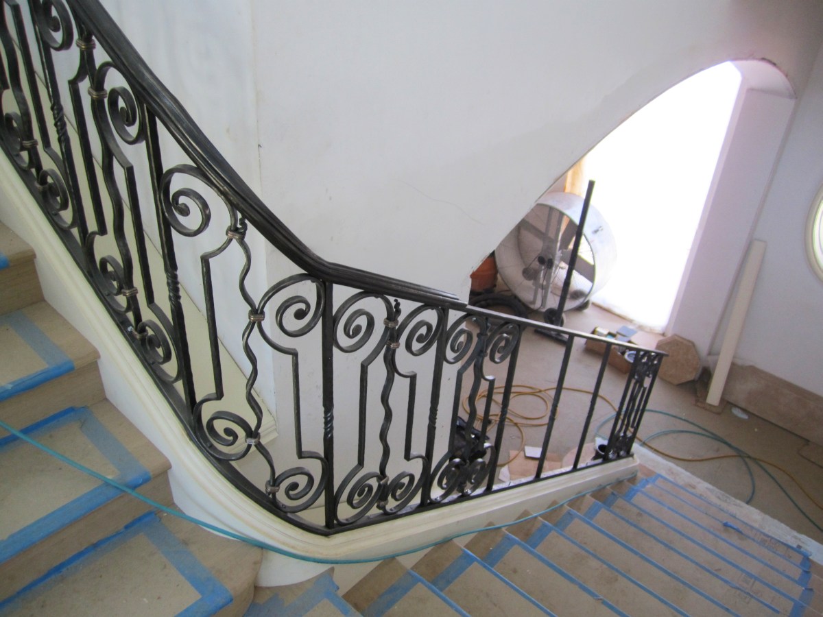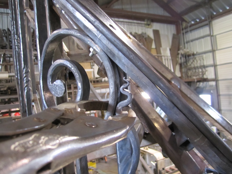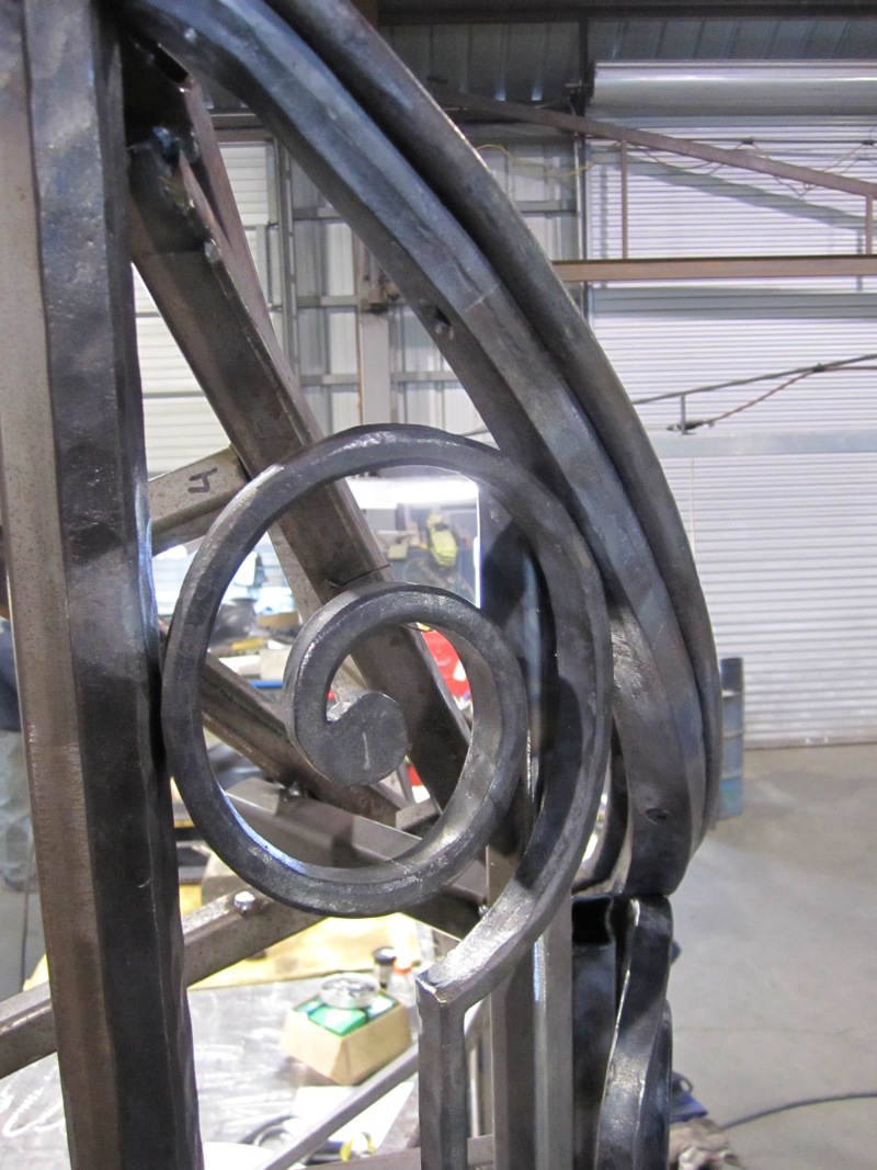 The woodworker provided the wood stringer form so that we could make a steel form to forge the top and bottom rails. This allowed us to hot bend the iron to lie perfectly on top of the stringer.