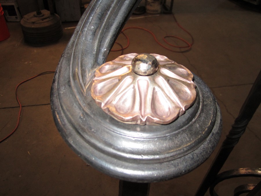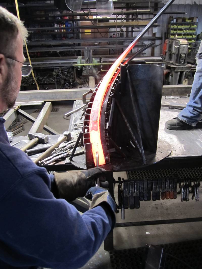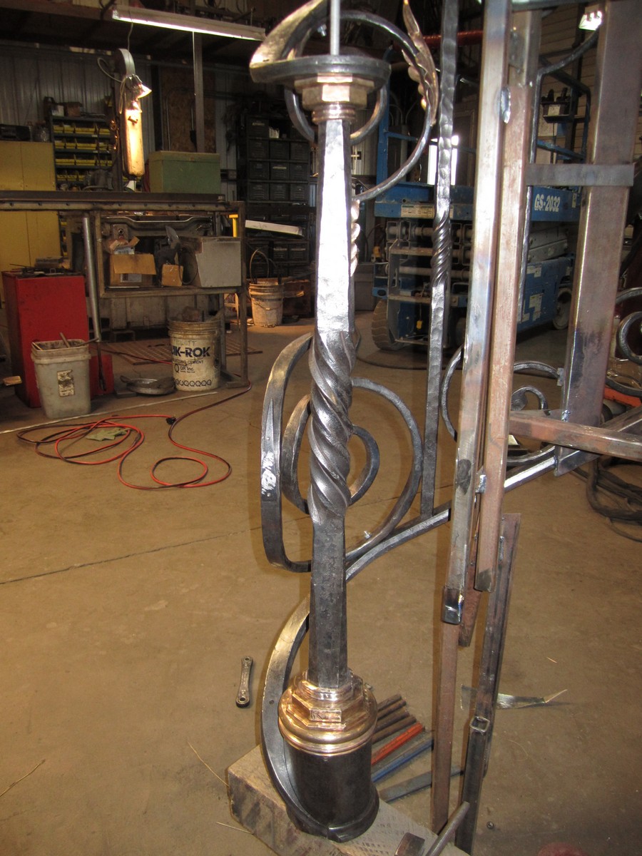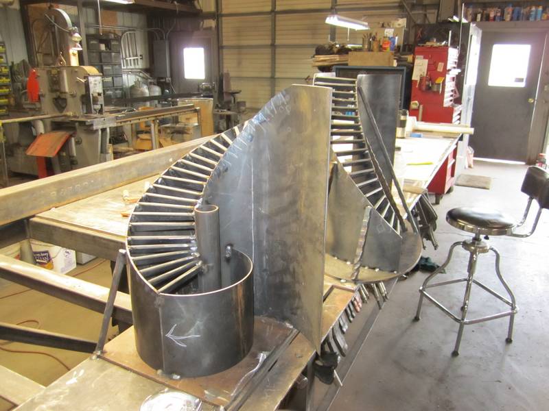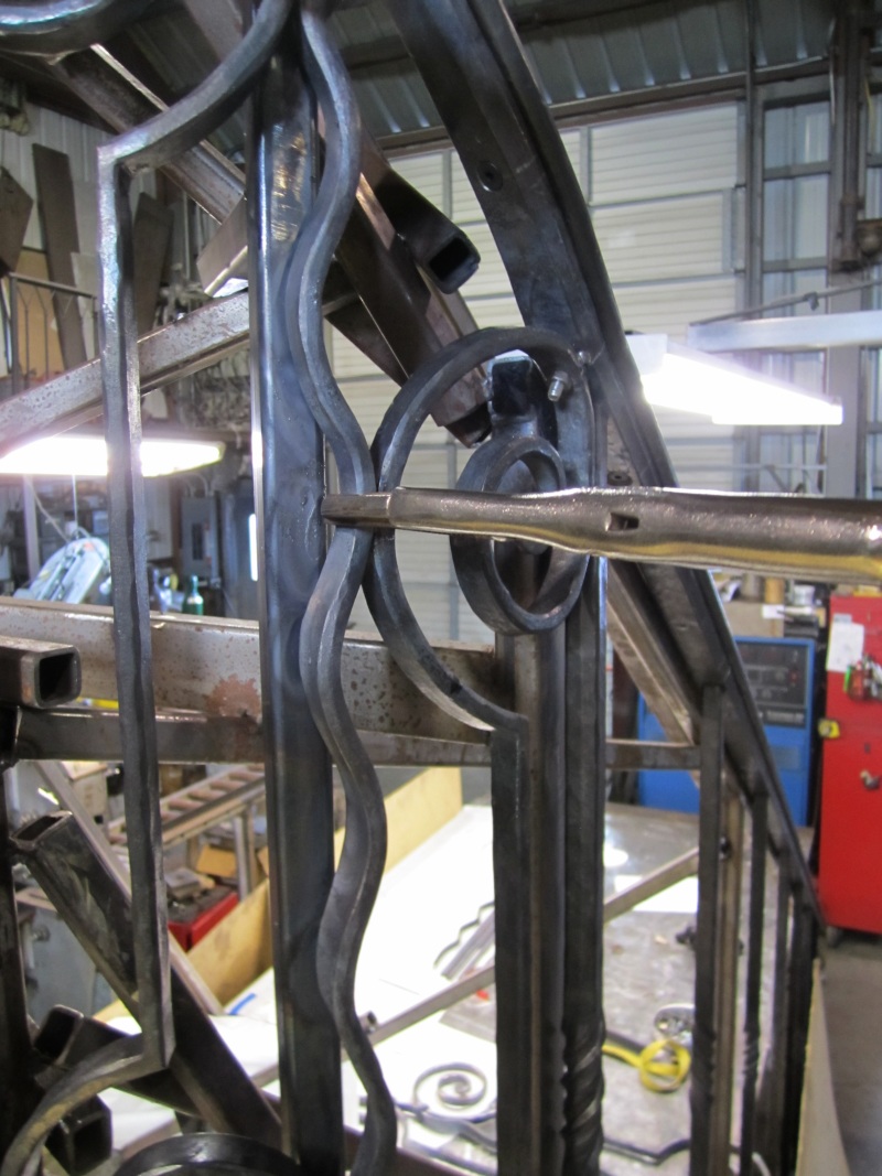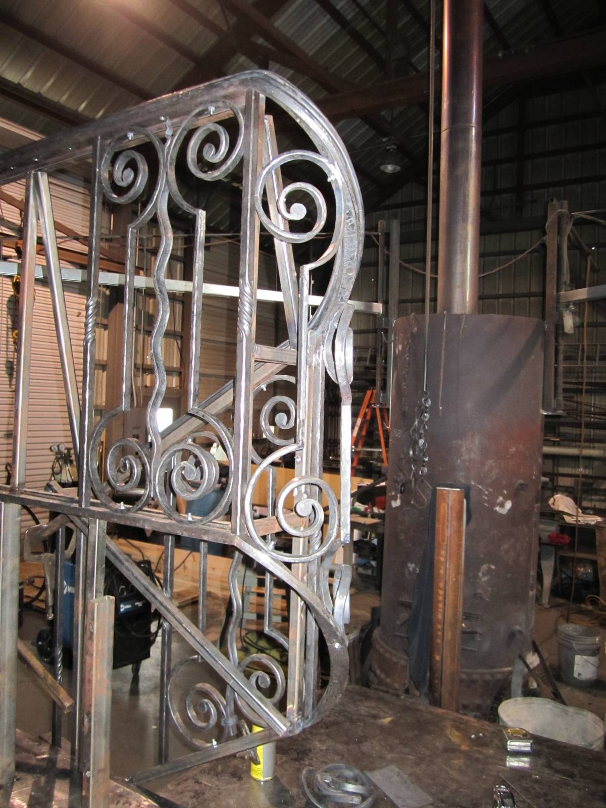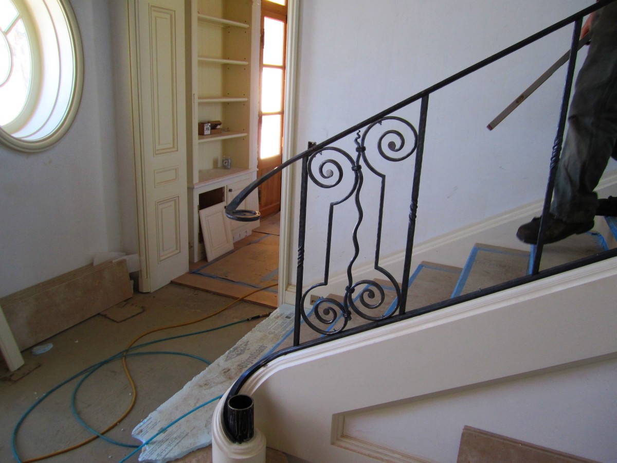 The woodworker provided the wood stringer form so that we could make a steel form to forge the top and bottom rails. This allowed us to hot bend the iron to lie perfectly on top of the stringer.