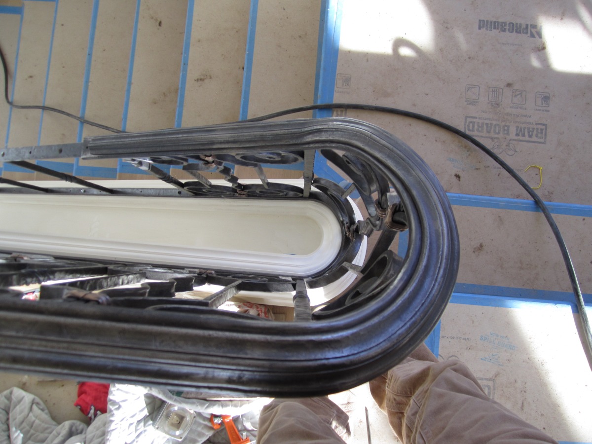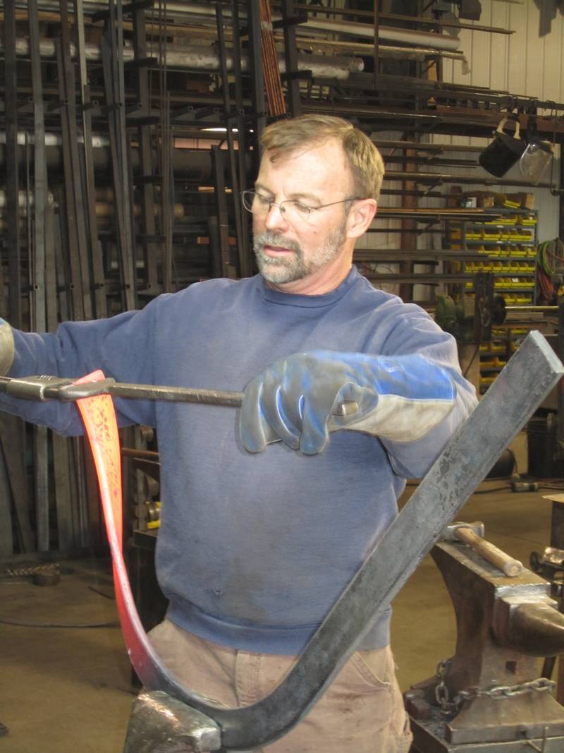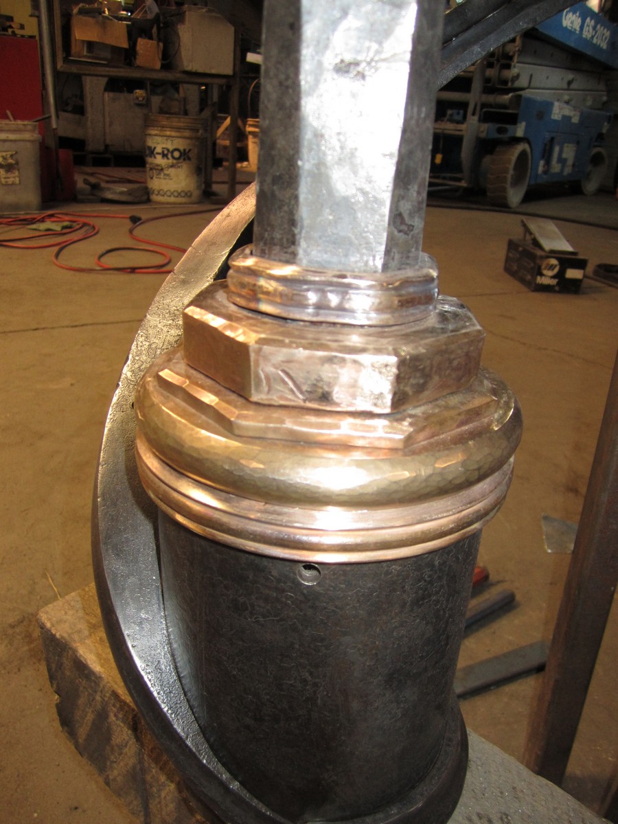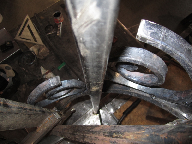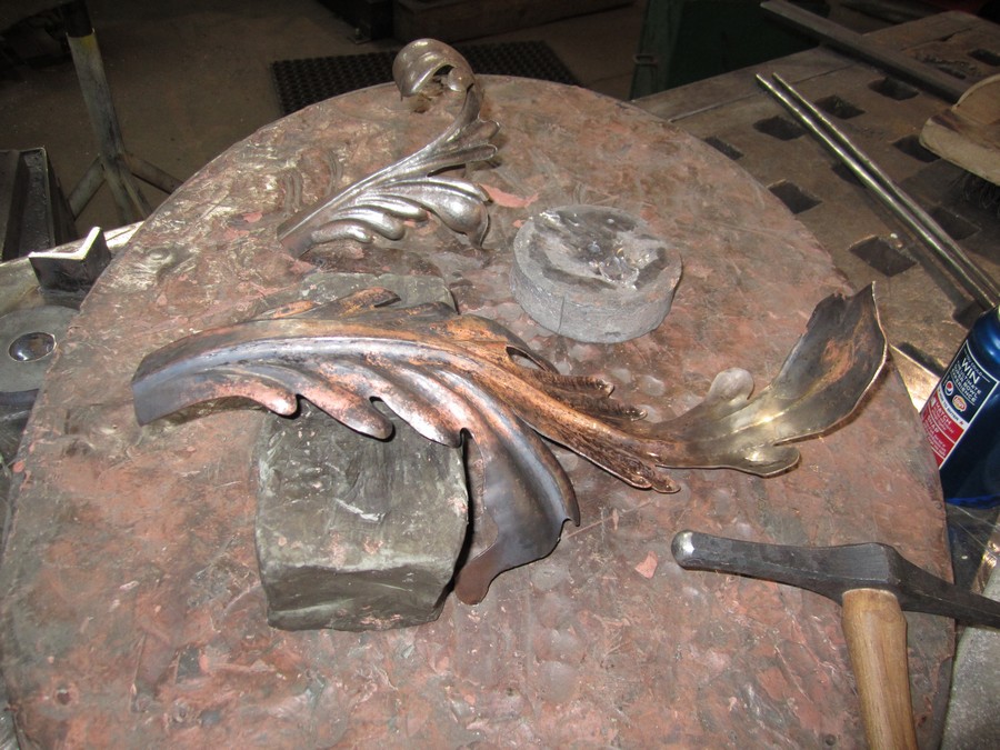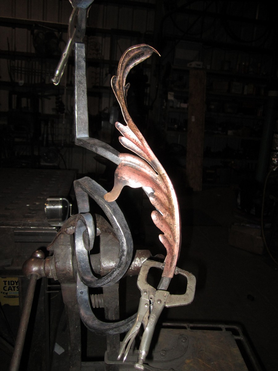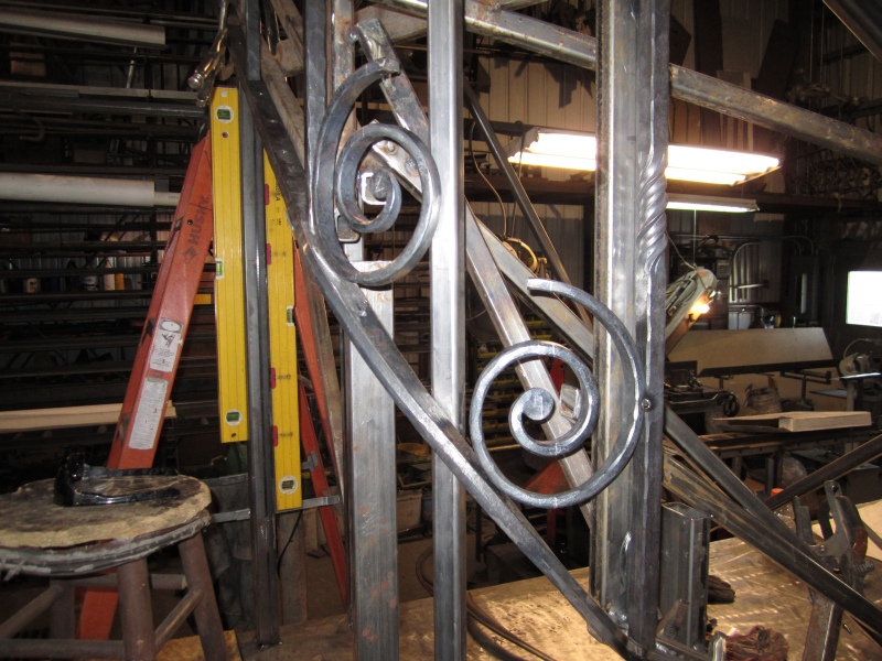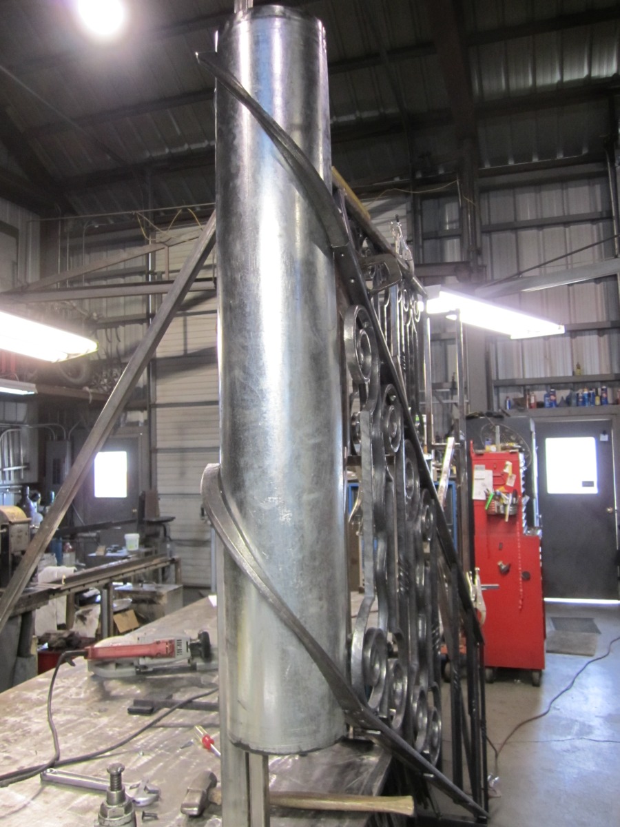 The woodworker provided the wood stringer form so that we could make a steel form to forge the top and bottom rails. This allowed us to hot bend the iron to lie perfectly on top of the stringer.