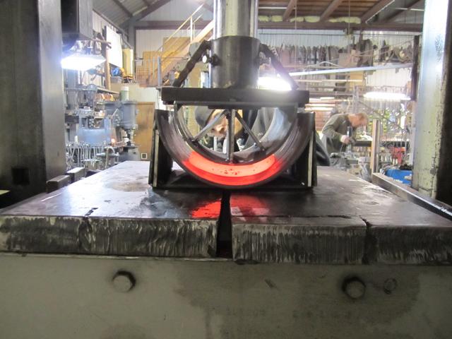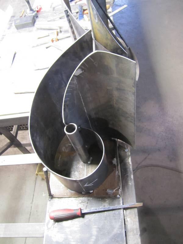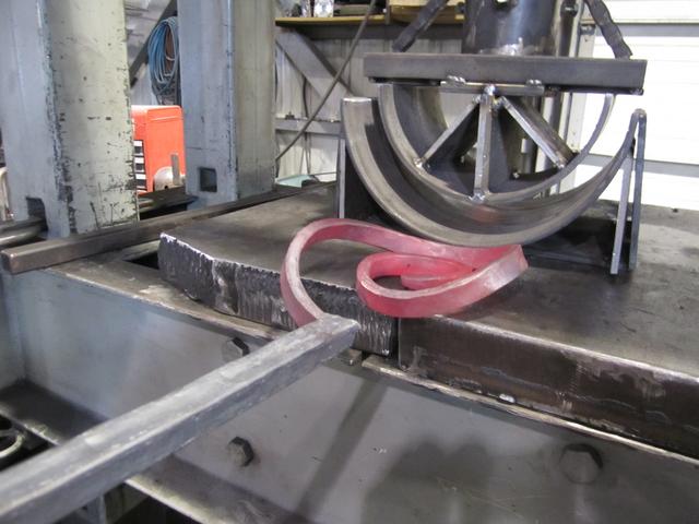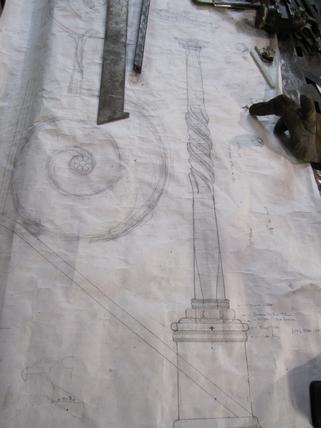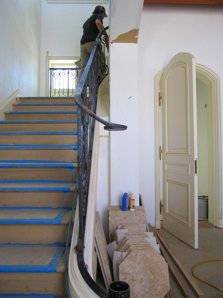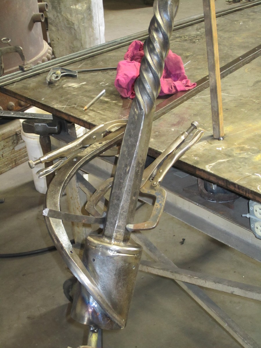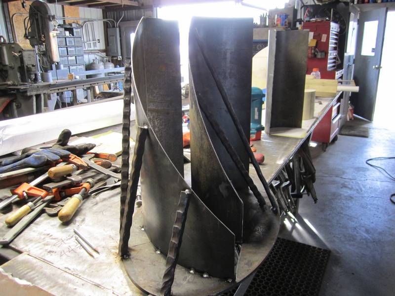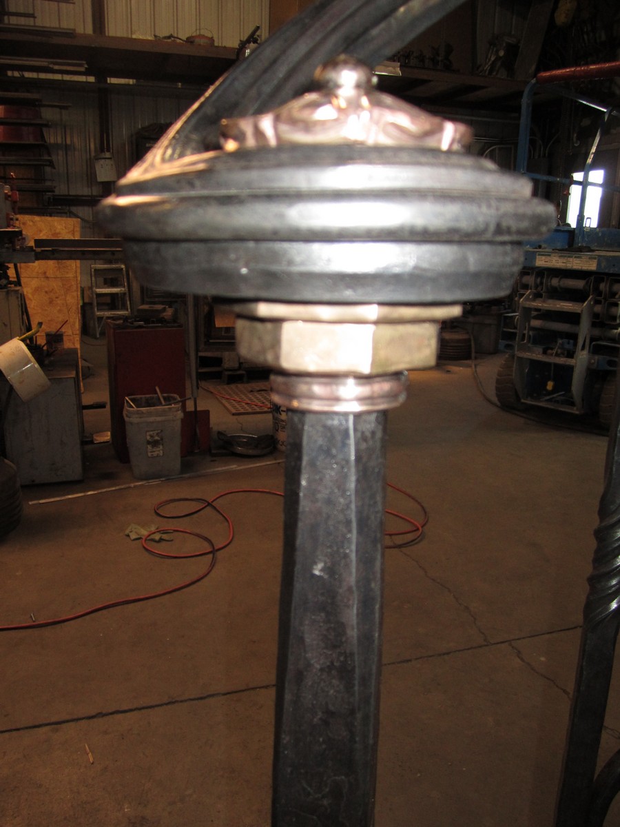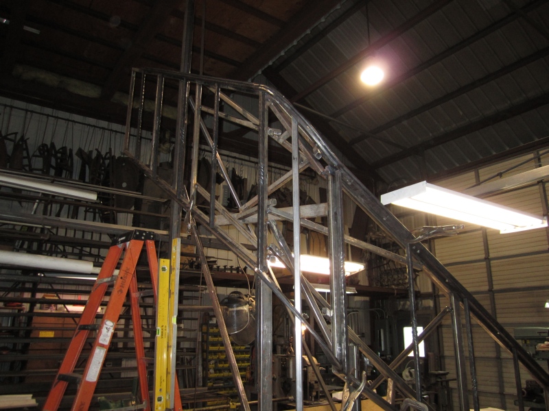 The woodworker provided the wood stringer form so that we could make a steel form to forge the top and bottom rails. This allowed us to hot bend the iron to lie perfectly on top of the stringer.